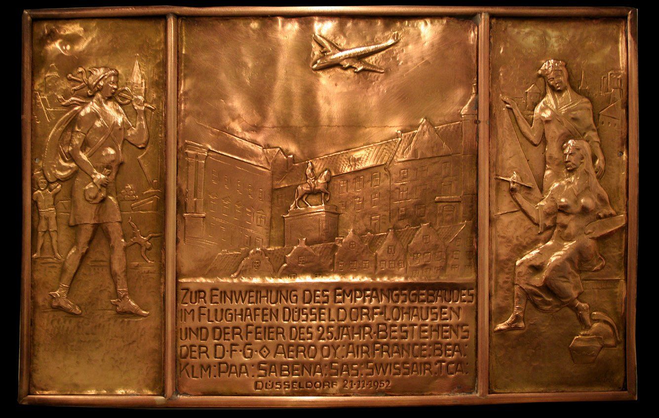 2007 war Dieter Stahns, der Enkel des Düsseldorfer Bildhauers und Gießerei-Besitzers Christian Heririch Wiehe (1874-1960) bei der Suche nach Werkem seines Großvaters, auf Hinweise gestoßen, wonach sich im Düsseldorfer Flughafen eine Gedenktafel aus dessen Hand befinden sollte.