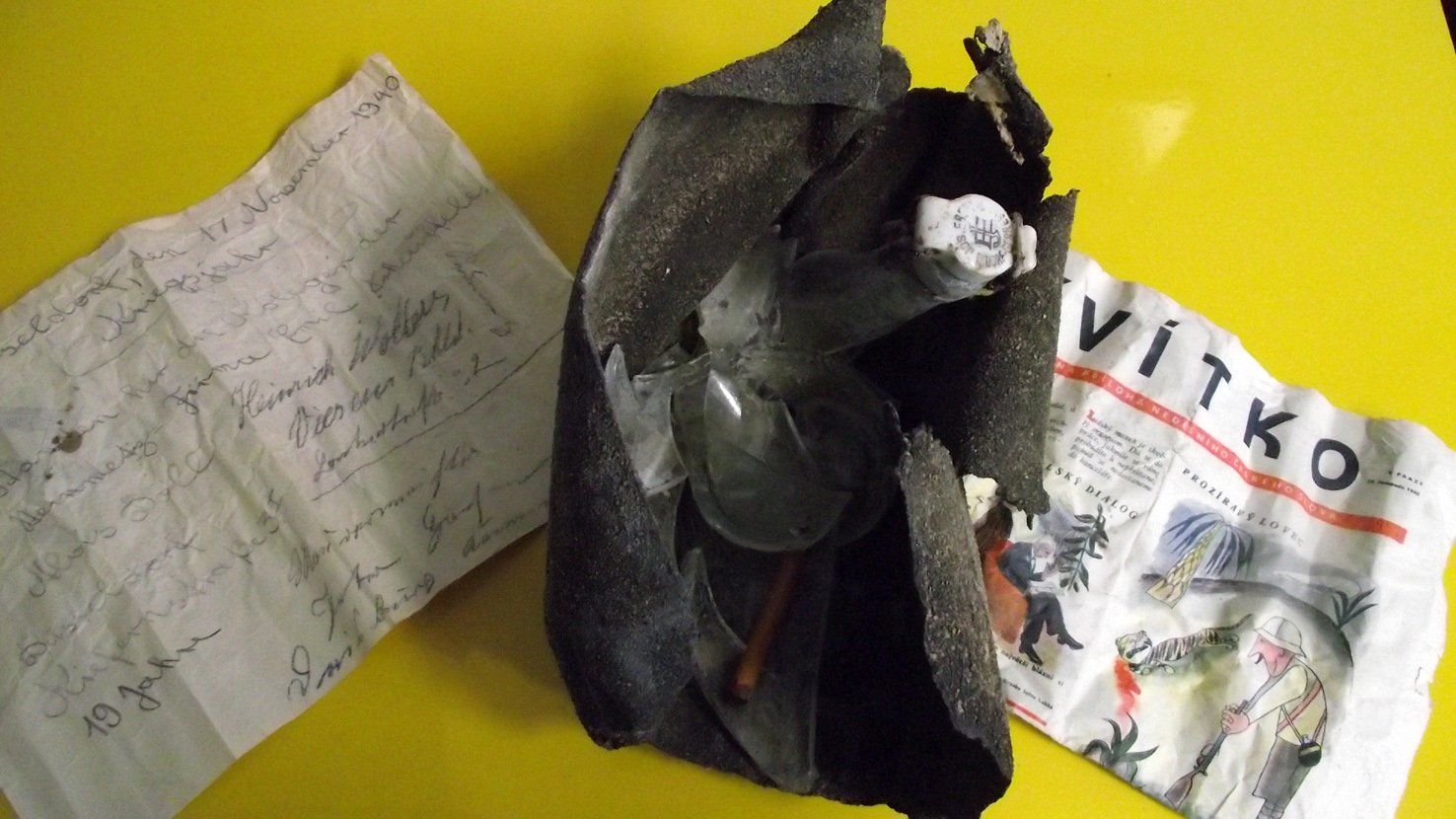 In eine Tschechische Zeitung aus dem Jahre 1941 packten sie einen Zettel, auf dem ihre Namen verzeichnet sind., dazu ein Hakenkreuz und die Zeile: »Im Kriegsjahr...«