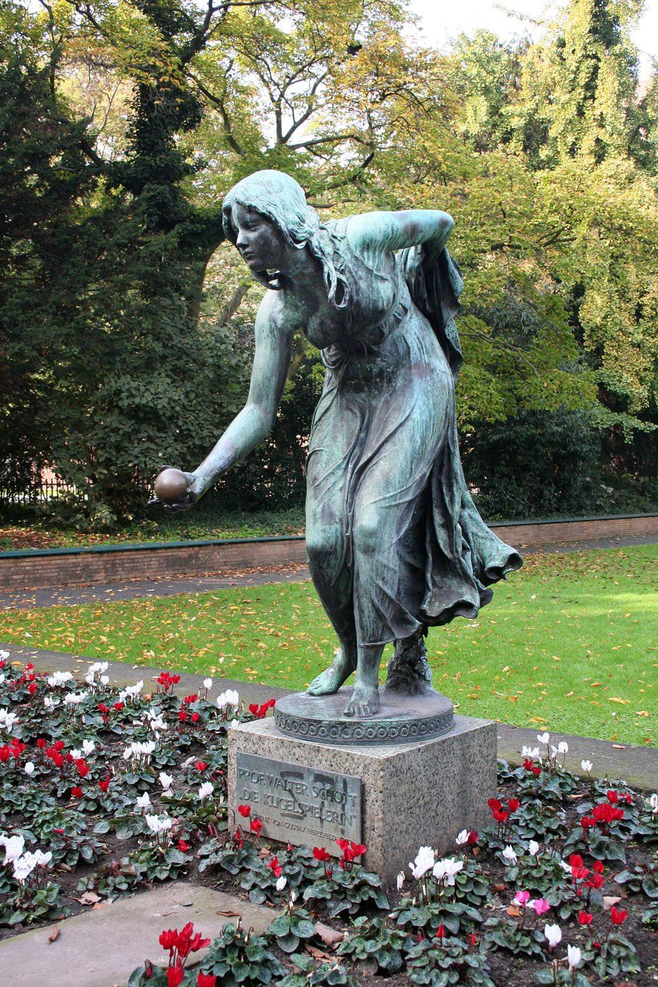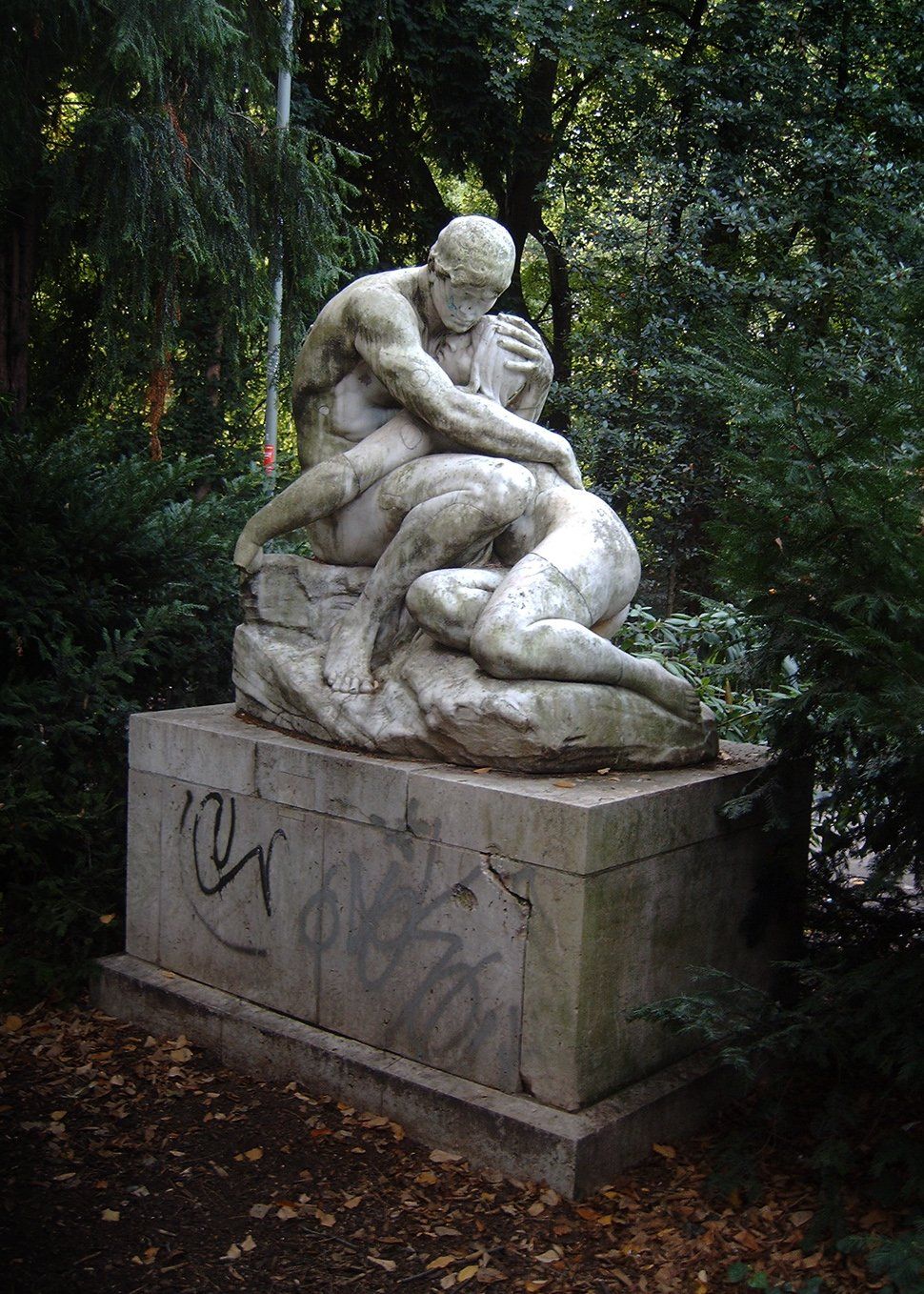 Im Jahr 2011 arbeitete eine Kolonne von Auszubildenden des Düsseldorfer Garten- und Landschaftsbetriebes an der Restaurierung des Sockels der Skulptur »Adam und Eva« im Florapark in Unterbilk. Die Marmorgruppe selbst war schon im Jahr 2008 mehr schlecht als recht restauriert worden. Deshalb unten ein Foto aus der Zeit vor der Erneuerung, als die Gruppe trotz massiver Beschädigung und elender Grafittis mehr Charme hatte als nach dem Eingriff. Dabei machten die Auszubildenden einen überraschenden Fund.
