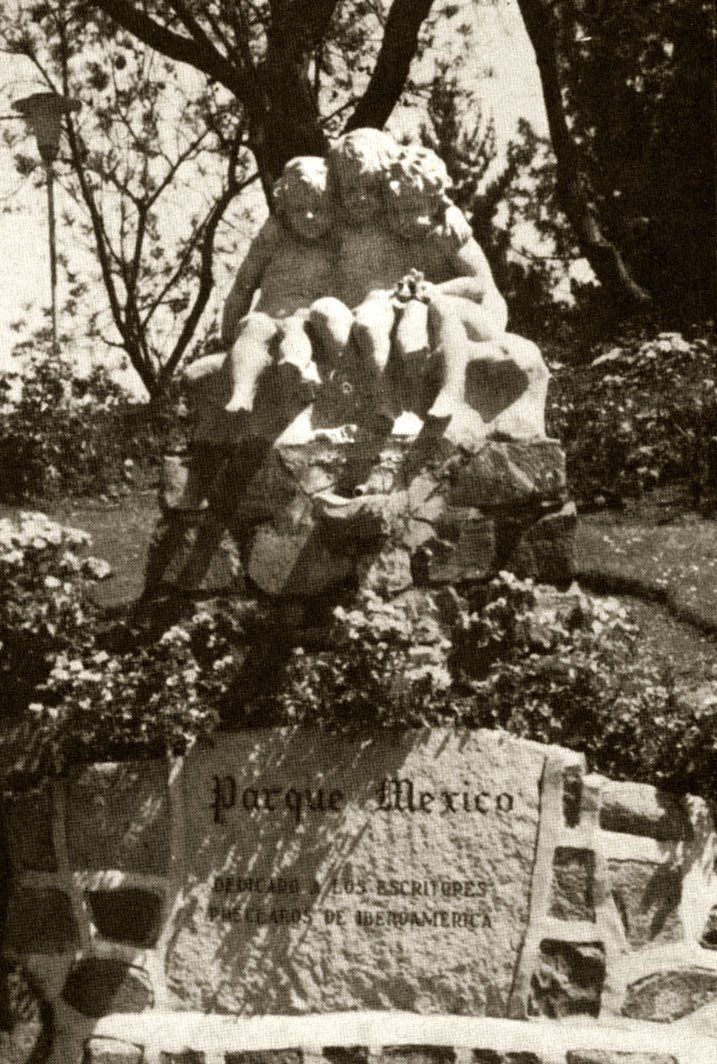 Die Inschrift auf der Tafel lautet: "Dedicado a los Escritores del Pelagos de Iboamerica" Die Brunnenanlage wurde zu unbekannter Zeit zu Ehren der lateinamerikanischen Schriftsteller errichtet. Der ebenfalls unbekannte Schöpfer könnte das berühmte Vorbild ebenso in Mexiko wie an einem der