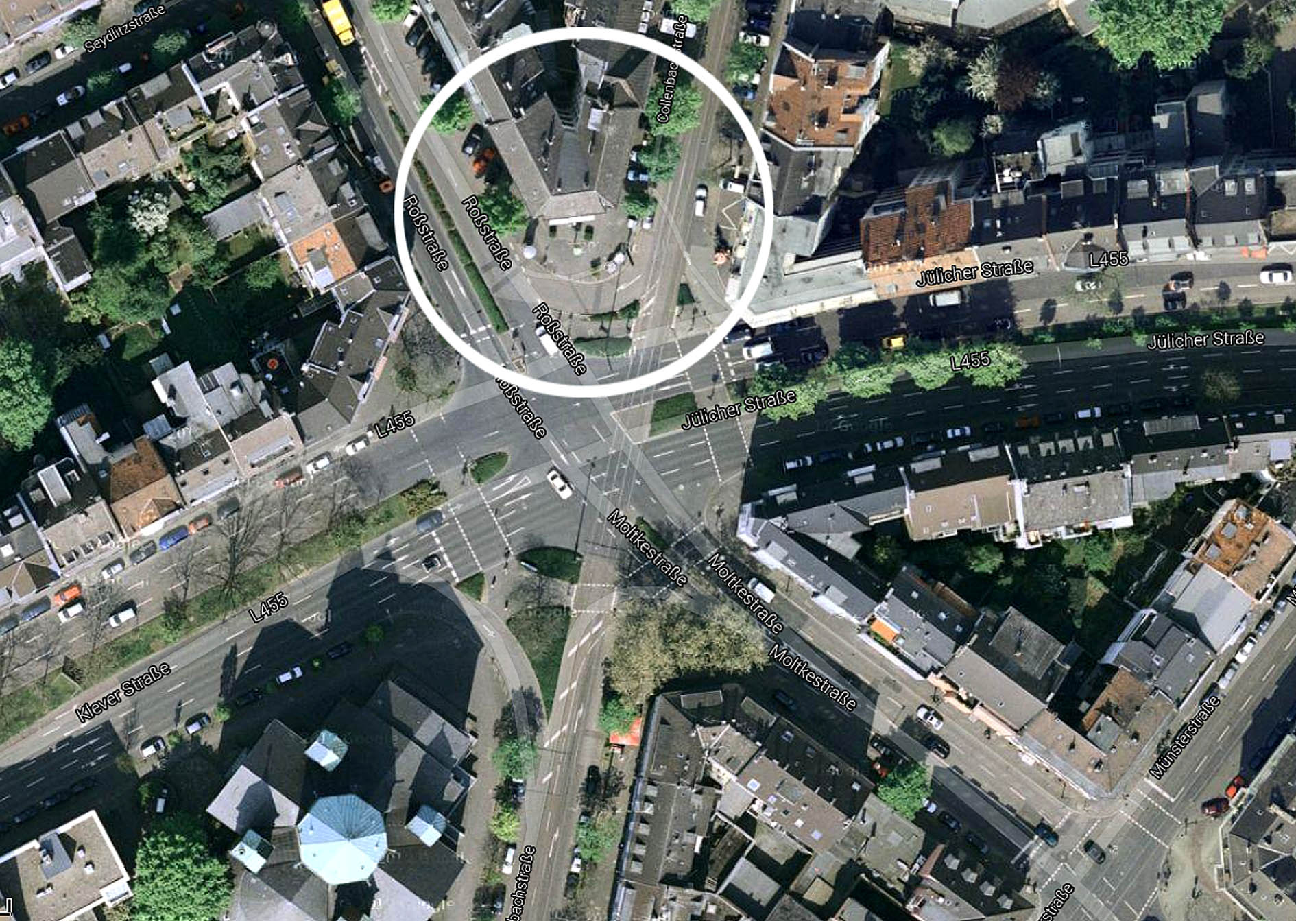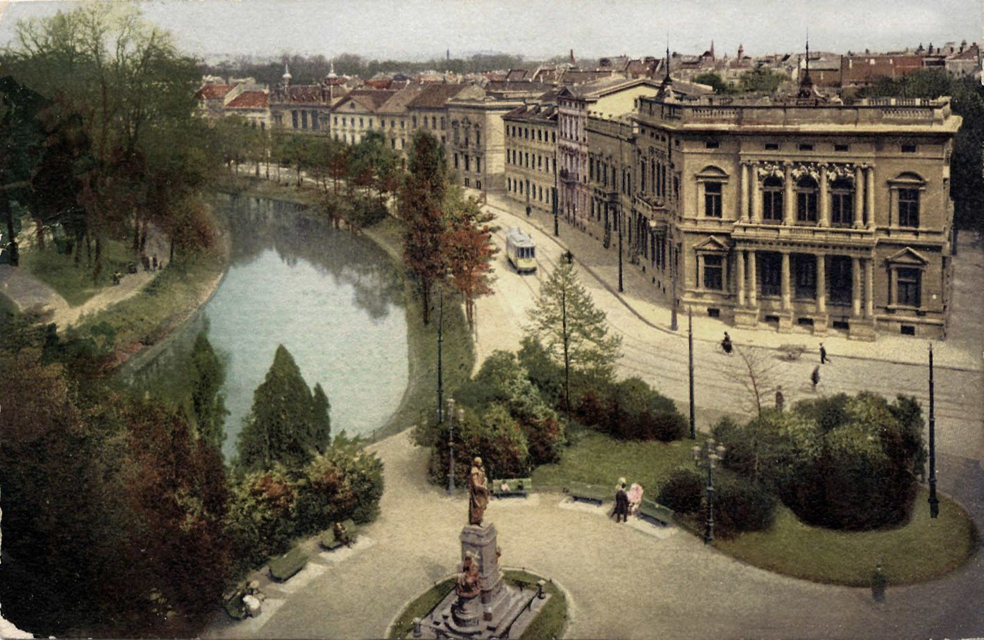 Die Situation am Corneliusplatz um 1900. Das Denkmal stand noch an seinem alten Platz, die Villa Trinkaus bildete den reizvollen Abschluss der Hofgartenstraße.
