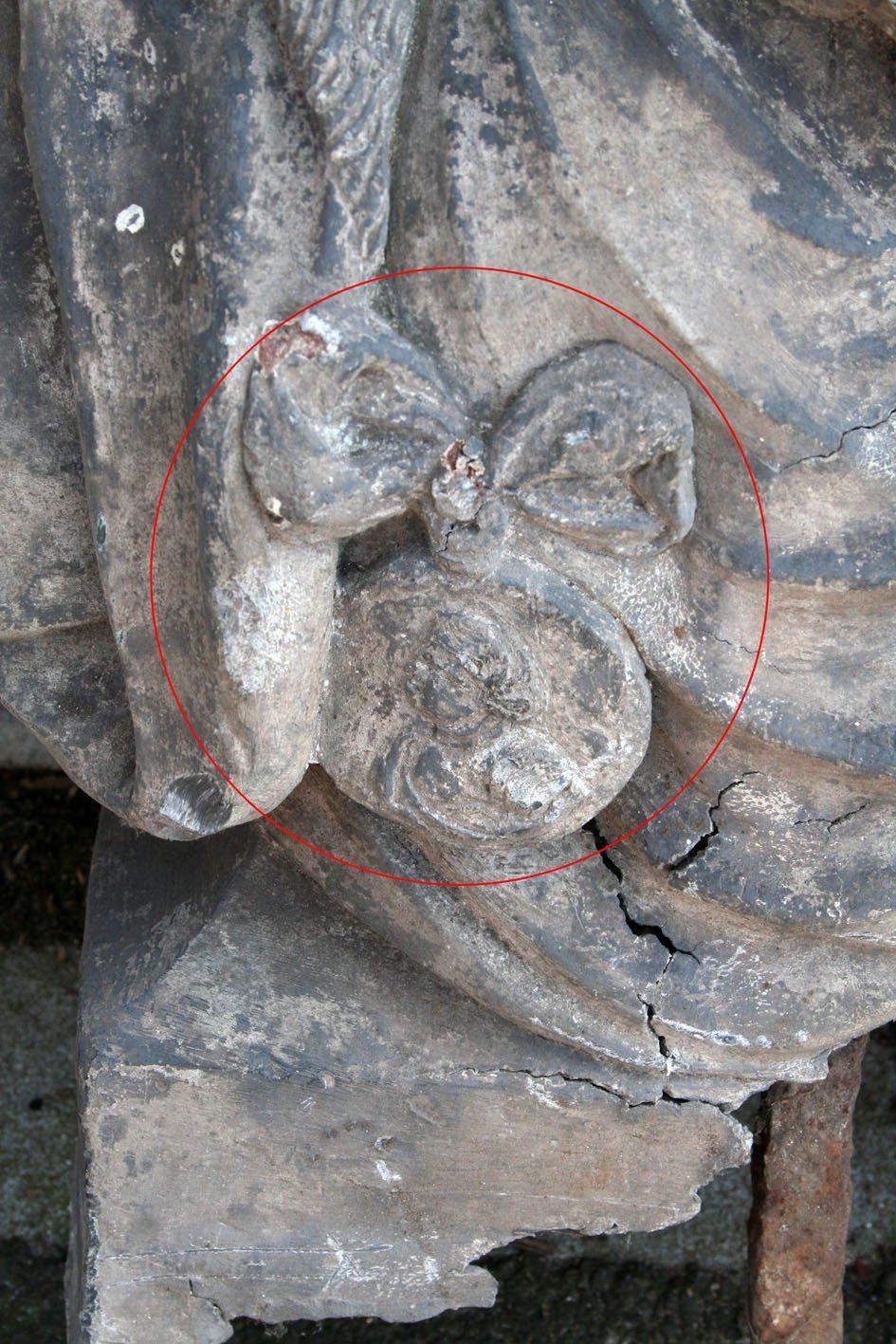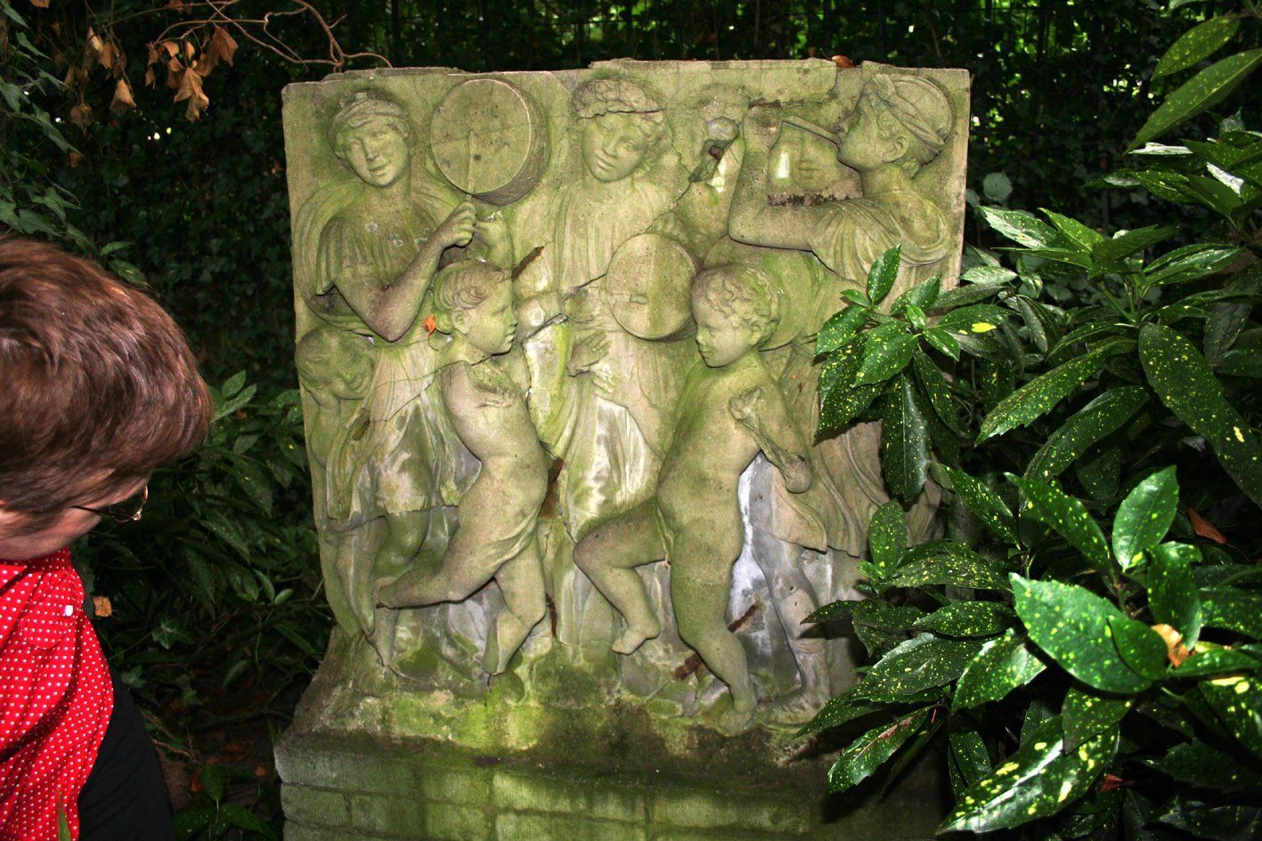 Bei einer gemeinsamen Begehung konnte das Steinguss-Relief tatsächlich, völlig überwuchert, am Zaun des Parkes aufgefunden werden. Unklar blieb, woher das Relikt stammt.