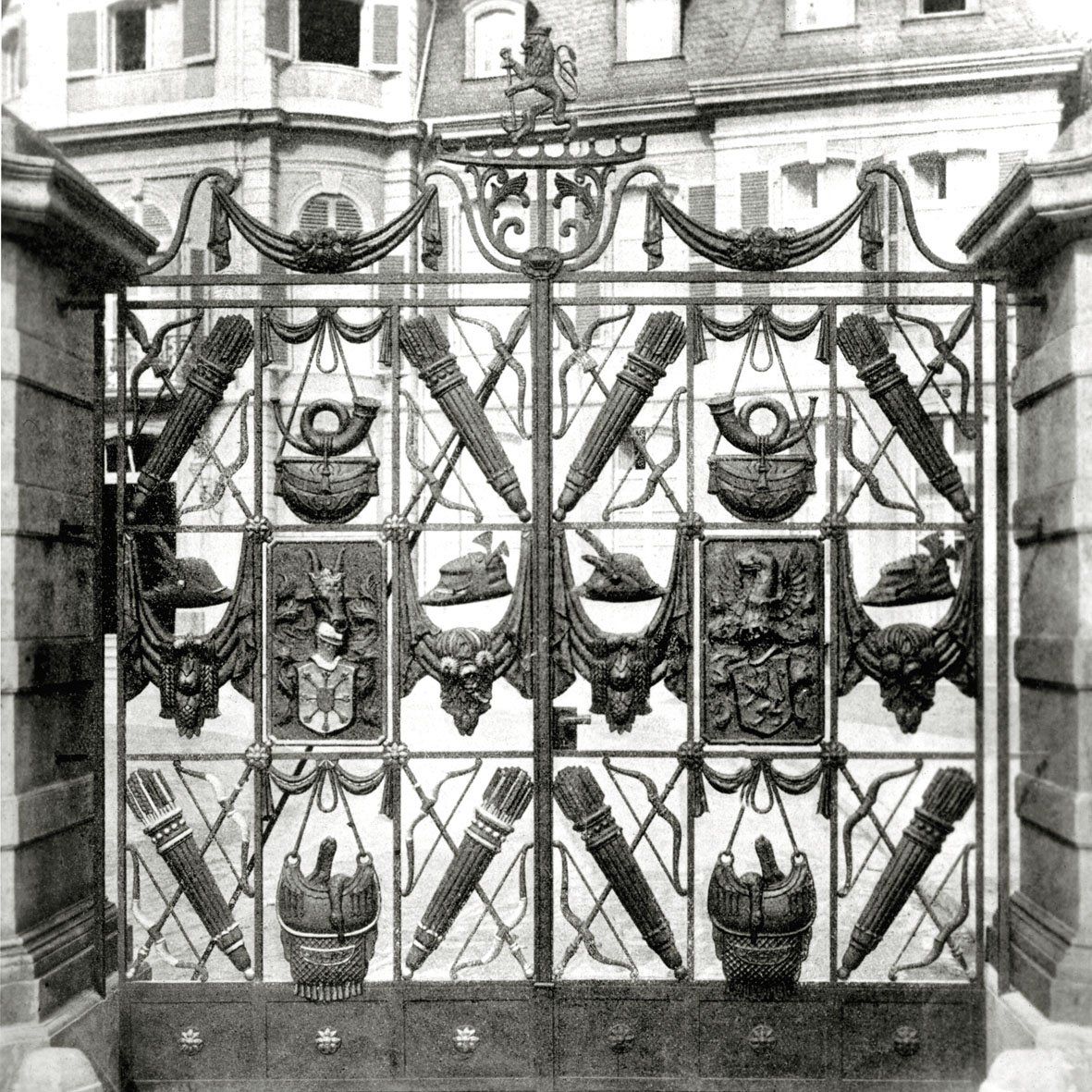 Der Architekt hatte in seinem Entwurf Stilelemente des Klassizismus und des Barock kreativ gemischt. Alle Motive, wie Pfeile, Köcher, Bogen, sind aus dem Arsenal der Jagdutensilien entnommen, sicherlich auch mit Inspirationen aus den Schnitzereien an den benachbarten Marstallgiebeln (0327). Gekrönt wurde das Tor selbstverständlich durch den Düsseldorfer Löwen.