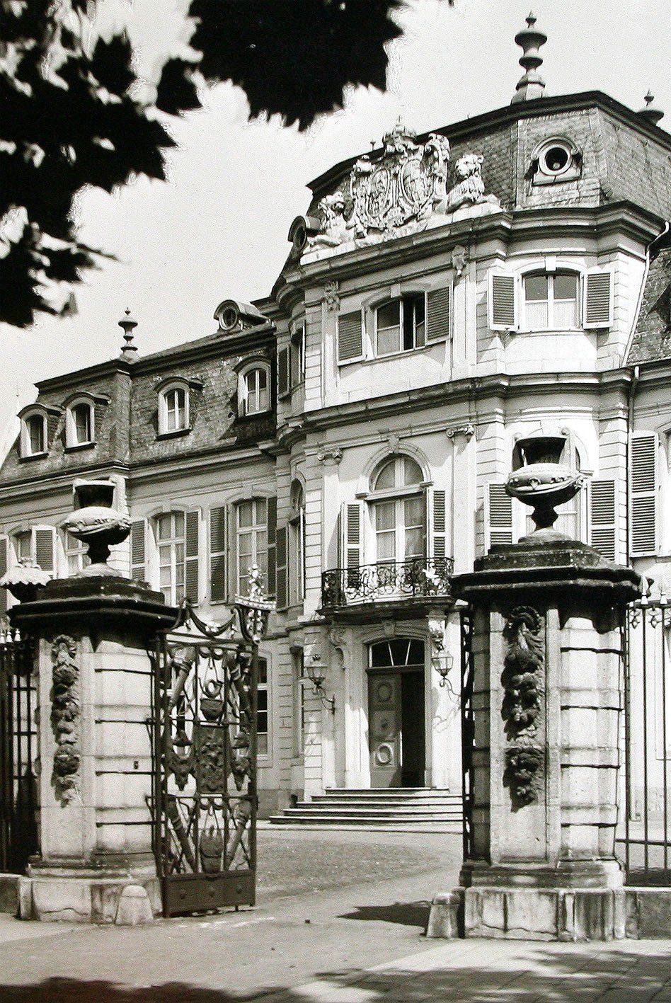Am 12. Juni 1943 wurde das 1769-1773 erbaute Schloss »Jägerhof« bei einem Bombenangriff fast gänzlich zerstört. Über die ganze Breite unbeschädigt blieben das Gitter zur Straße hin und die Postamente, an denen es befestigt war, mit den Putten von Hubert Netzer (0328).