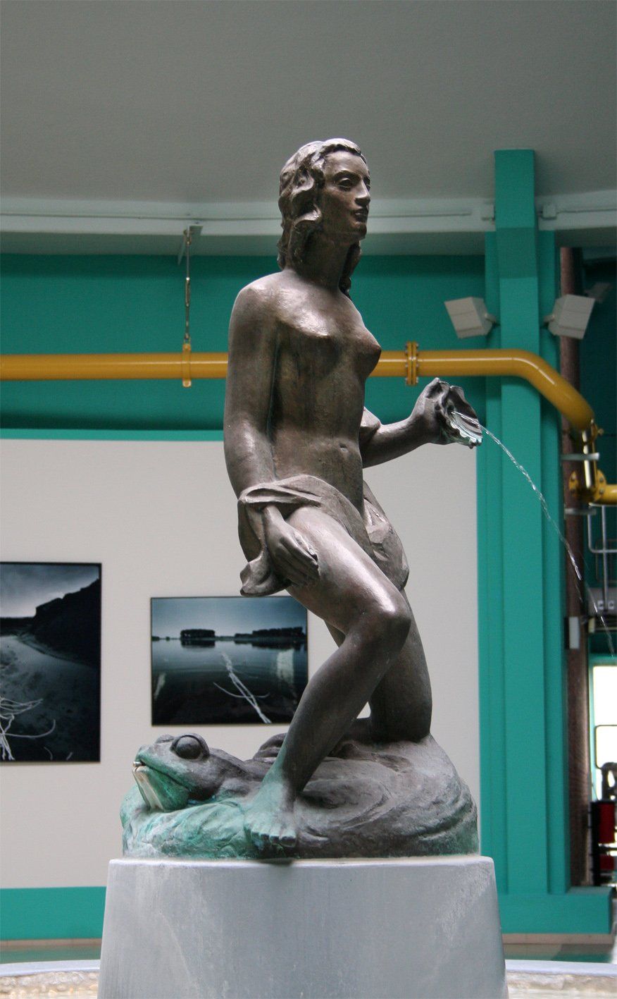 Einzig das Plätschern des Brunnens erfrischt, trotz aller Monotonie. Was nebenan in meterhohen Bottichen passiert, allegorisiert die Bronzedame in der stillen Raummitte: Das Prinzip der Wasseraufbereitung. Die Jungfrau gibt in betörender Reinheit Frisches aus, während die feiste Kröte zu ihren Füßen das brackige Abwasser ausspeit. Die ist allerdings abgeschaltet, denn ihr Wasserstrahl hatte die Plinthe zu - wohl unerwünschter - Oxydation gebracht.