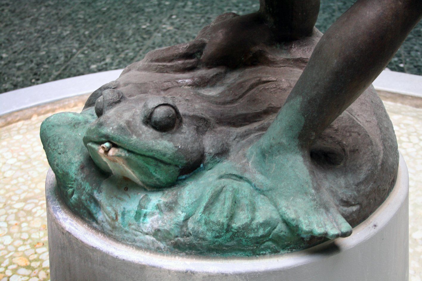 Anders als bei den europäischen Versionen, fungieren die drei Frösche in diesem Fall nicht als Wasserspeier. Sie halten die Breitmäuler fest geschlossen, das Wasser rieselt aus den Felsen hervor. Eben ein stiller »Brunnen des Lächelns«.