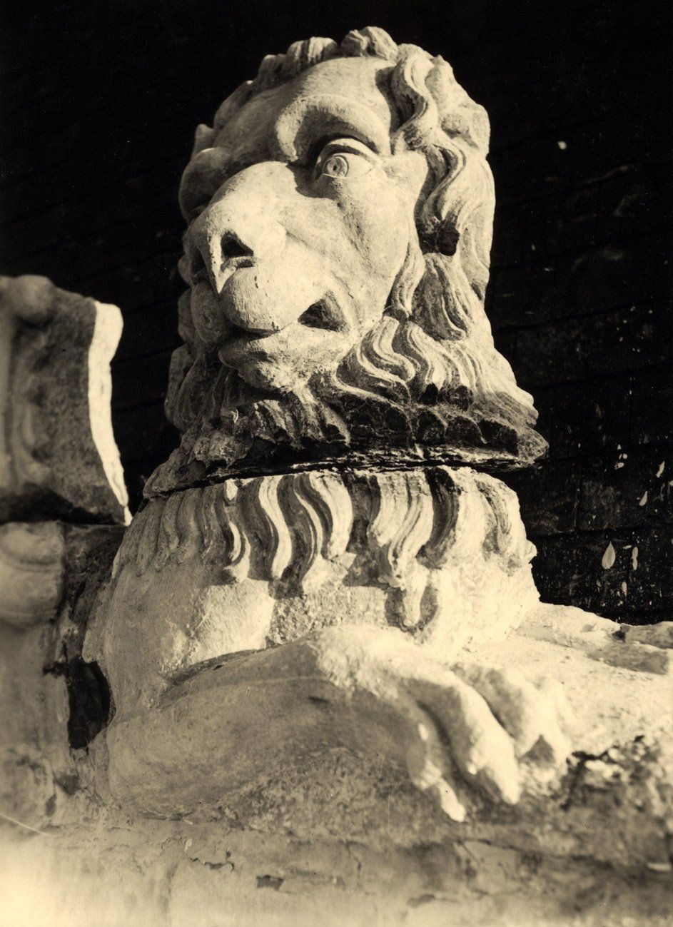Der Kopf des rechten Löwen war durch den Bombenangriff von 1943 vom Hals getrennt, lag aber noch auf den Rest des Körpers auf. Willi Hoselmann hatte das Foto vom Landeskonservator bekommen, denn er wurde beim Wiederaufbau des Schlosses im Jahr 1950 mit der Neuschaffung des Wappens beauftragt.