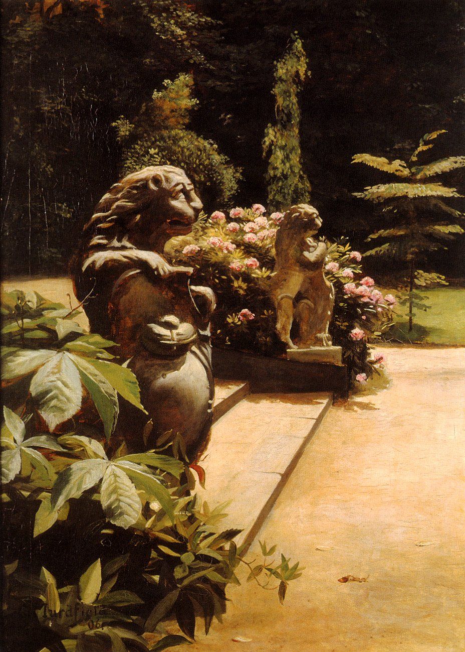 Links: Gemälde von Carl Murdfiled: Von diesen barocken Löwen im Park stammte der Kopf nicht (separates Kapitel), aber auch sie waren eine "Entdeckung"
