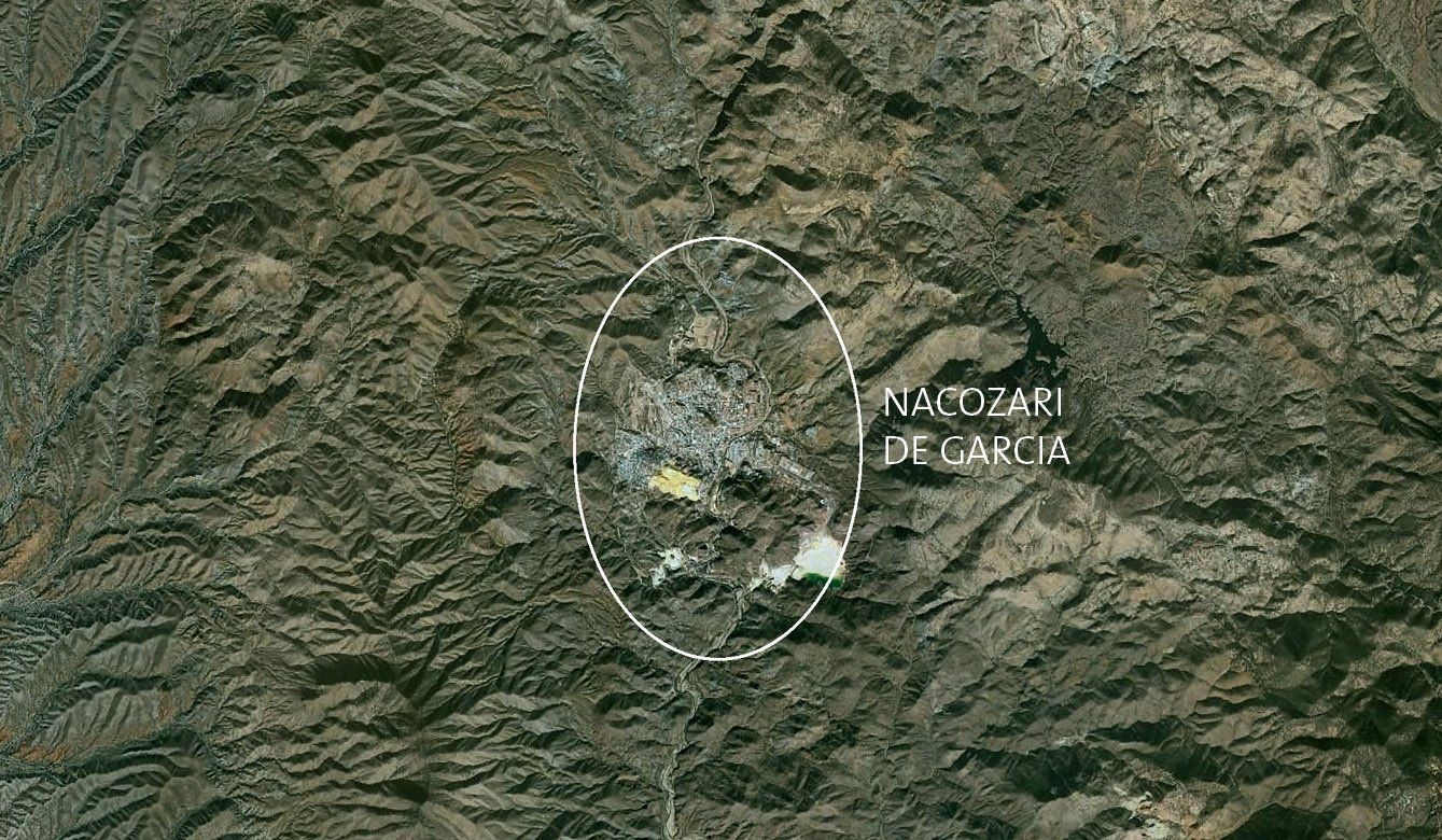 Ein Blick auf die Karte zeigt die isolierte Position der kleinen Bergarbeiterstadt Nacozari de Garcia in der Bergwelt von Sonora, Mexiko.