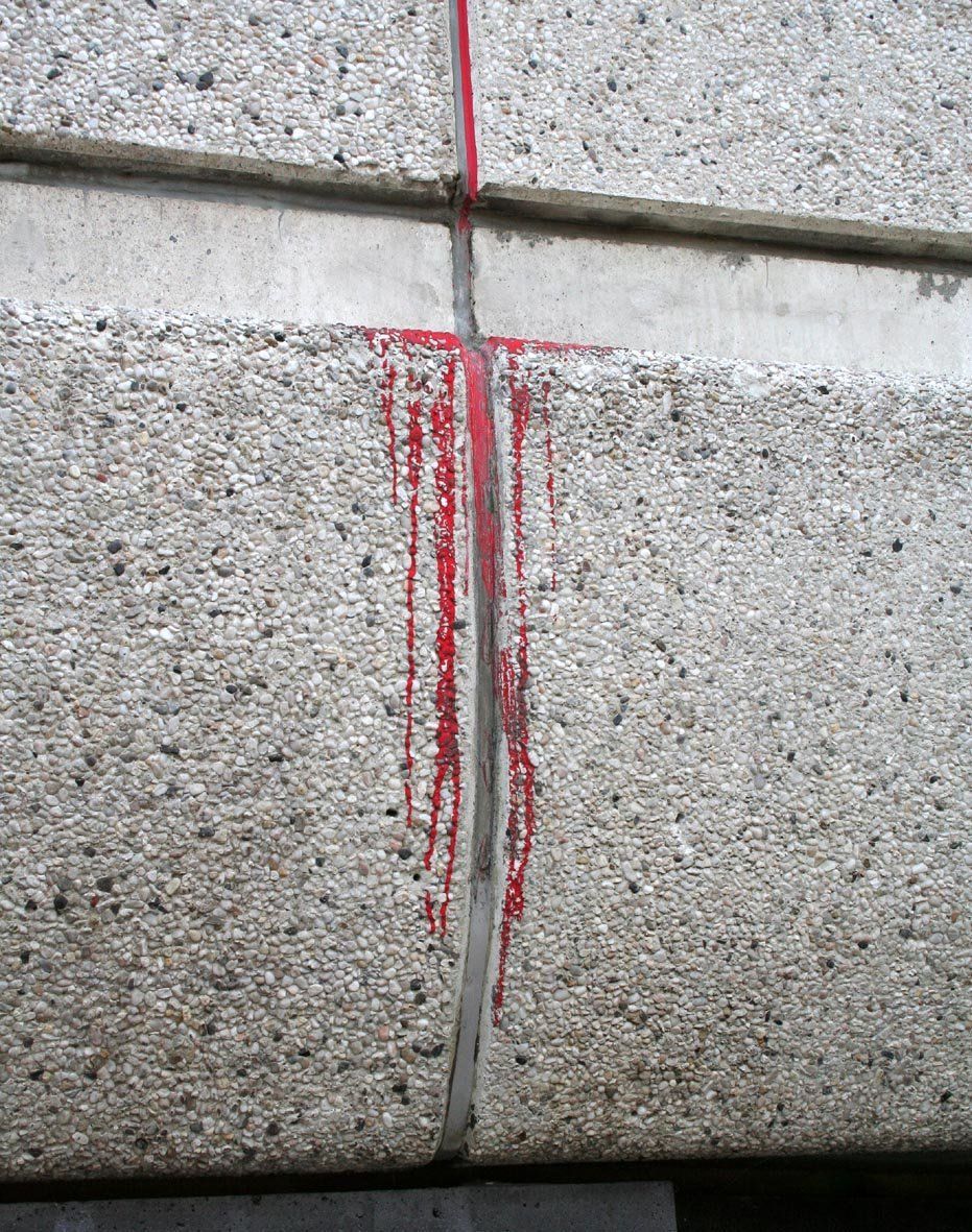 Byars schenkte der Kunsthalle, in Erinnerung an die wilden Tage in Düsseldorf, eine blutrote Abschiedsträne, die er an der Fassade des Kunsthallen-Kubus als scharlachrote Linie bis hinunter führte, wo sie am Fassadenversprung in kleine Rinnsale zerstob.